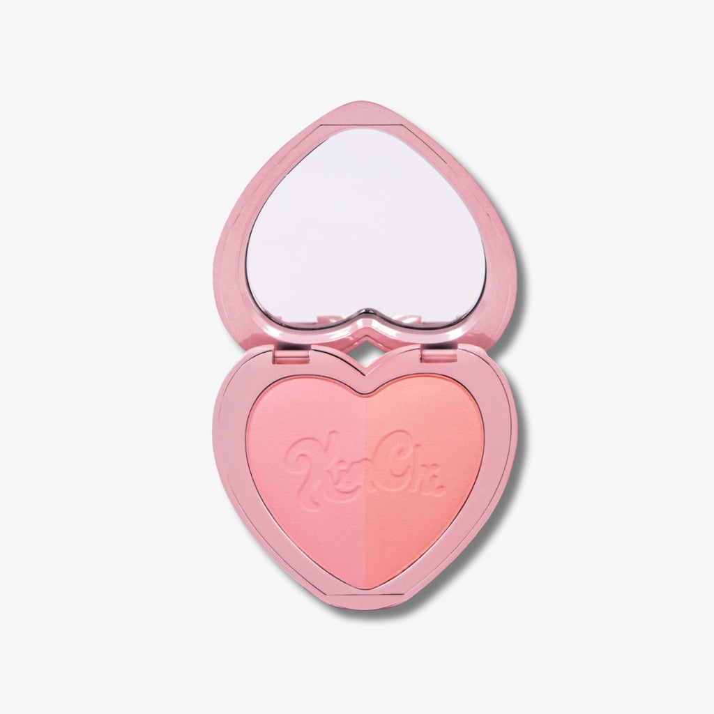 - Two-tone blush housed in a pink, heart-shaped, mirrored compact